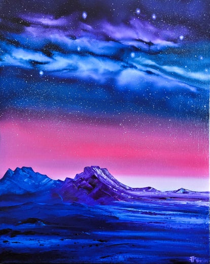 Peinture de montagne : utilisation de techniques mixtes via de la peinture acrylique.